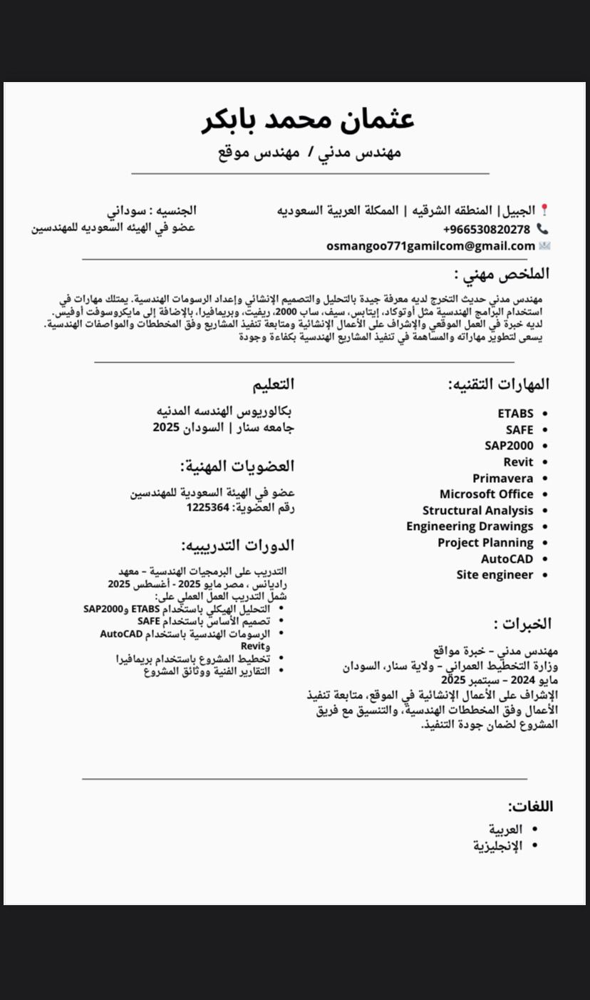 مهندس مدني سوداني الجنسية عضو في الهيئة السعودية للمهندسين ابحث عن فرصة عمل في مجال الهندسة المدنية داخل المملكة العربية السعودية. امتلك معرفة جيدة في التصميم الانشائي واعداد الرسومات الهندسية، مع اجادة استخدام البرامج الهندسية مثل AutoCAD وETABS وSAP2000 وSAFE وRevit. جاهز للعمل فورا، وأسعى لاكتساب خبرة عملية والمساهمة في تطوير المشاريع. يسعدني التواصل لأي فرصة مناسبة