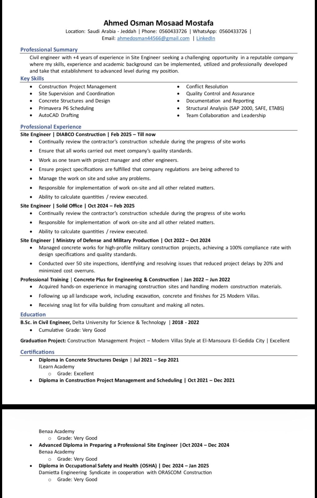 مهندس مدني خبرة + 4 سنوات في أعمال الخرسانات والتشطيبات وأعمال المكتب الفني من حصر وعمل مستخلصات خبرة فعليه سنة كاملة في المملكة في بعض مشاريع الفلل السكنيه الخاصه قادر على تنفيذ واستلام جميع البنود بكفاءة عالية طبقا للمواصفات والجدول الزمني قادر على العمل ضمن فريق والعمل تحت ضغط ابحث عن فرصة عمل مناسبة