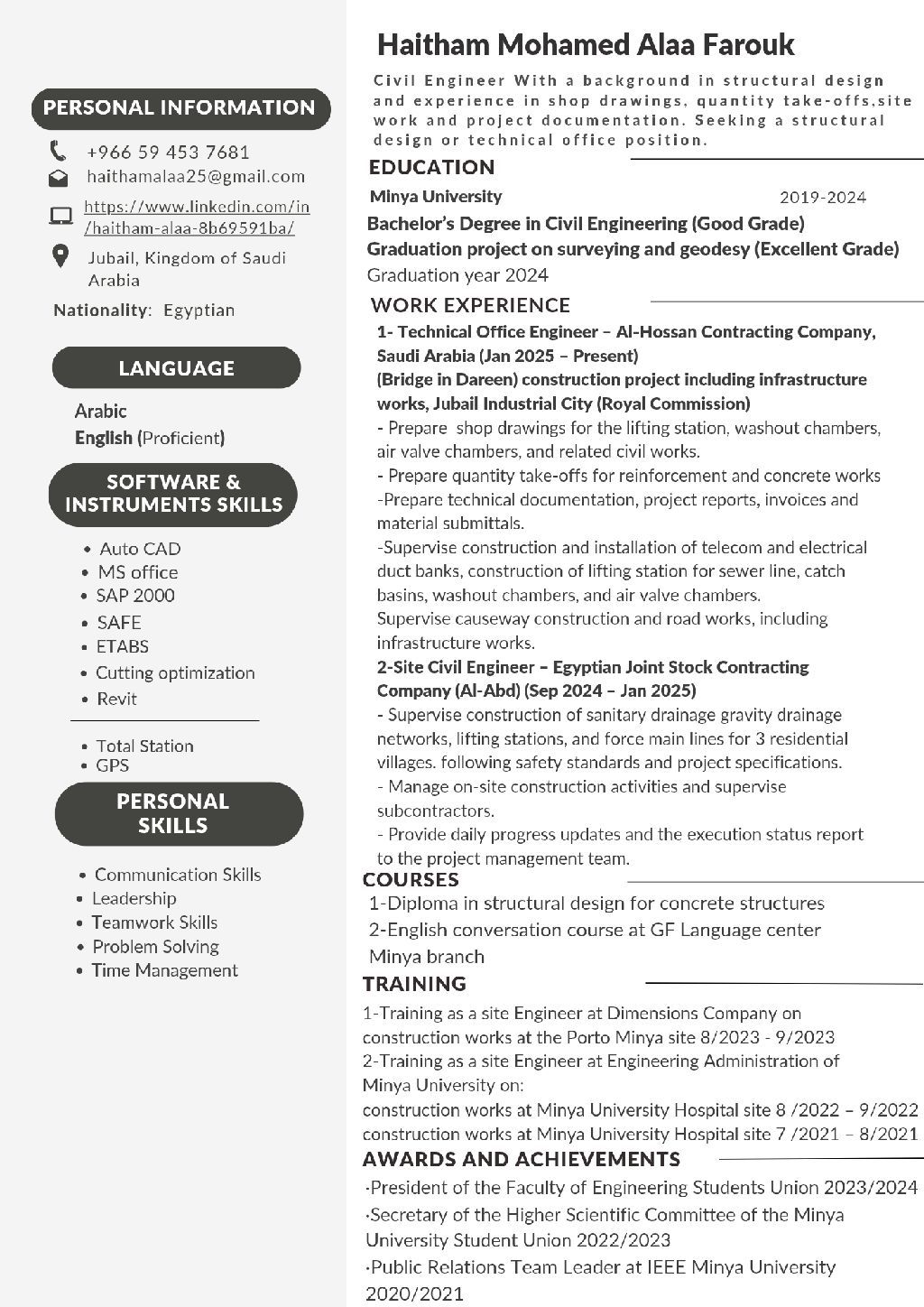 مهندس مدني اعمل حاليا كمهندس مكتب فني بمشروع تابع للهيئة الملكية في الجبيل في السعودية، وابحث عن فرصة في التصميم الانشائي أو المكتب الفني. المهارات والمهام اعداد ومراجعة الرسومات التنفيذية، حصر الكميات والمستخلصات، التنسيق والاشراف على التنفيذ سابقا على شبكات الصرف الصحي ومحطات الرفع. البرامج AutoCAD - Excel - SAP2000 - ETABS - SAFE اجادة الانجليزية (ممتاز) رخصة قيادة سعودية، متواجد داخل المملكة