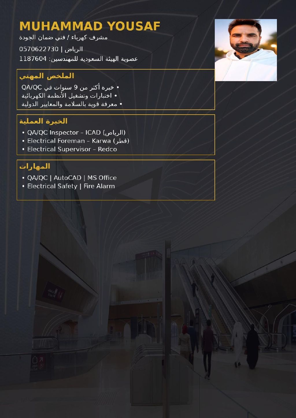 مشرف كهرباء ذو خبرة تزيد عن 9 سنوات في ضمان الجودة والفحص والاختبارات والتشغيل والاشراف الميداني. ماهر في التفتيش الكهربائي والالتزام بمعايير السلامة والتنسيق مع الاستشاريين. حاصل على عضوية الهيئة السعودية للمهندسين ولديه معرفة قوية بالمعايير الدولية. يمتلك قدرة مثبتة على إدارة الفرق وضمان جودة العمل وانجاز المشاريع بكفاءة ضمن المواعيد المحددة
