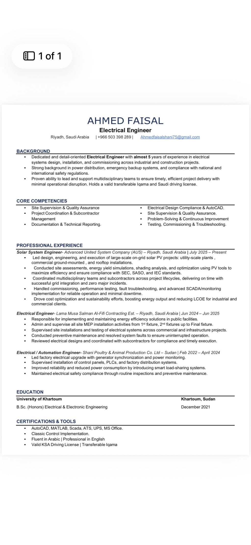 مهندس كهرباء 5 سنوات خبرة الرياض متخصص في تصميم وتنفيذ مشاريع الطاقة الشمسية On - Grid، اشراف MEP، تركيب PLC، التشغيل، الصيانة والاختبار. خبرة في الطاقة الشمسية، المشاريع التجارية والبنية التحتية، أنظمة الطاقة الاحتياطية، والامتثال لمعايير SEC وSASO. مهارات AutoCAD, SCADA, MATLAB، إدارة المقاولين. بكالوريوس هندسة كهربائية - إقامة قابلة للنقل + رخصة قيادة سعودية. ابحث عن فرصة جديدة