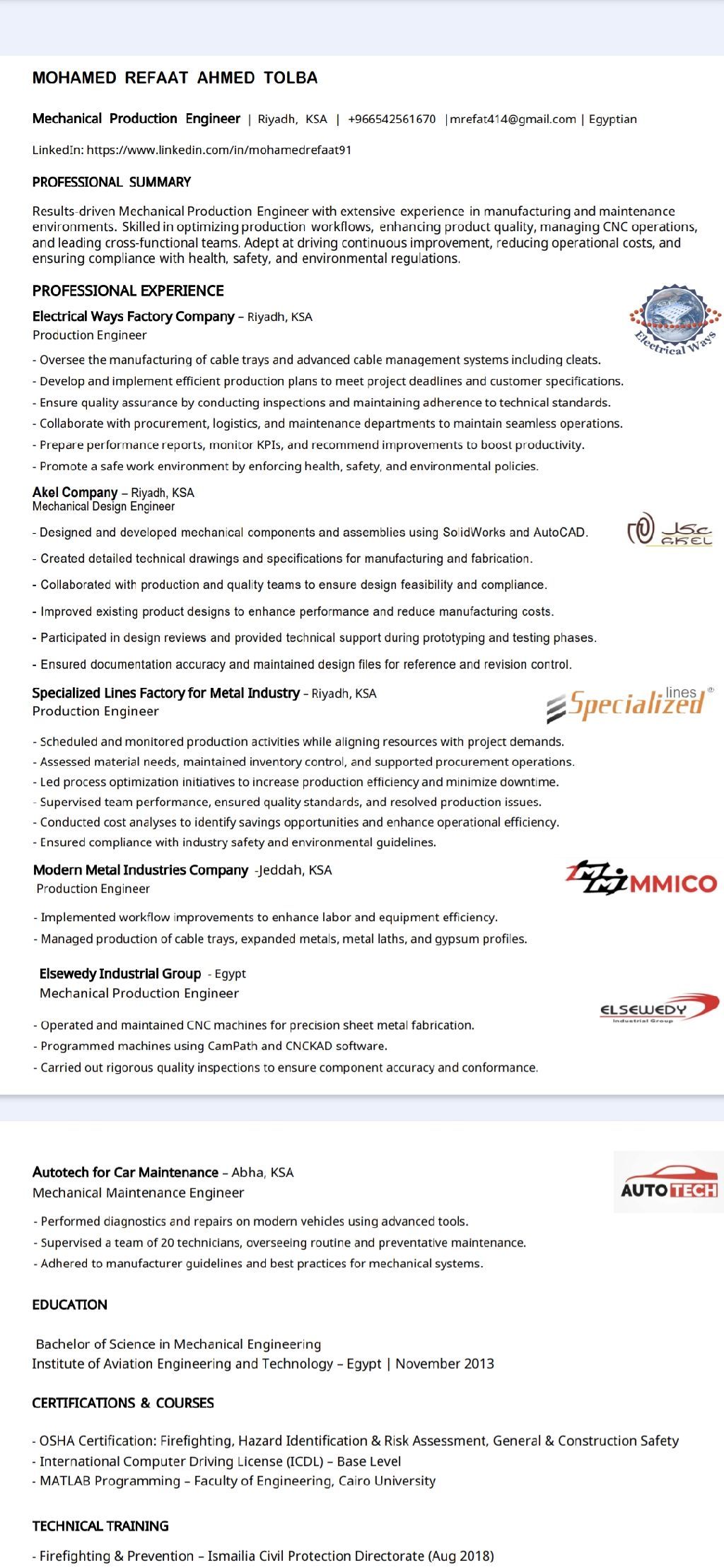 مهندس ميكانيكا خبرة 12 سنة في مجال الانتاج حوامل الكابلات المعدنية والانشاءات المعدنية