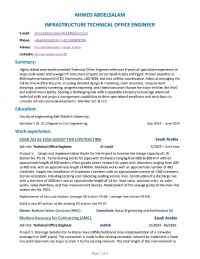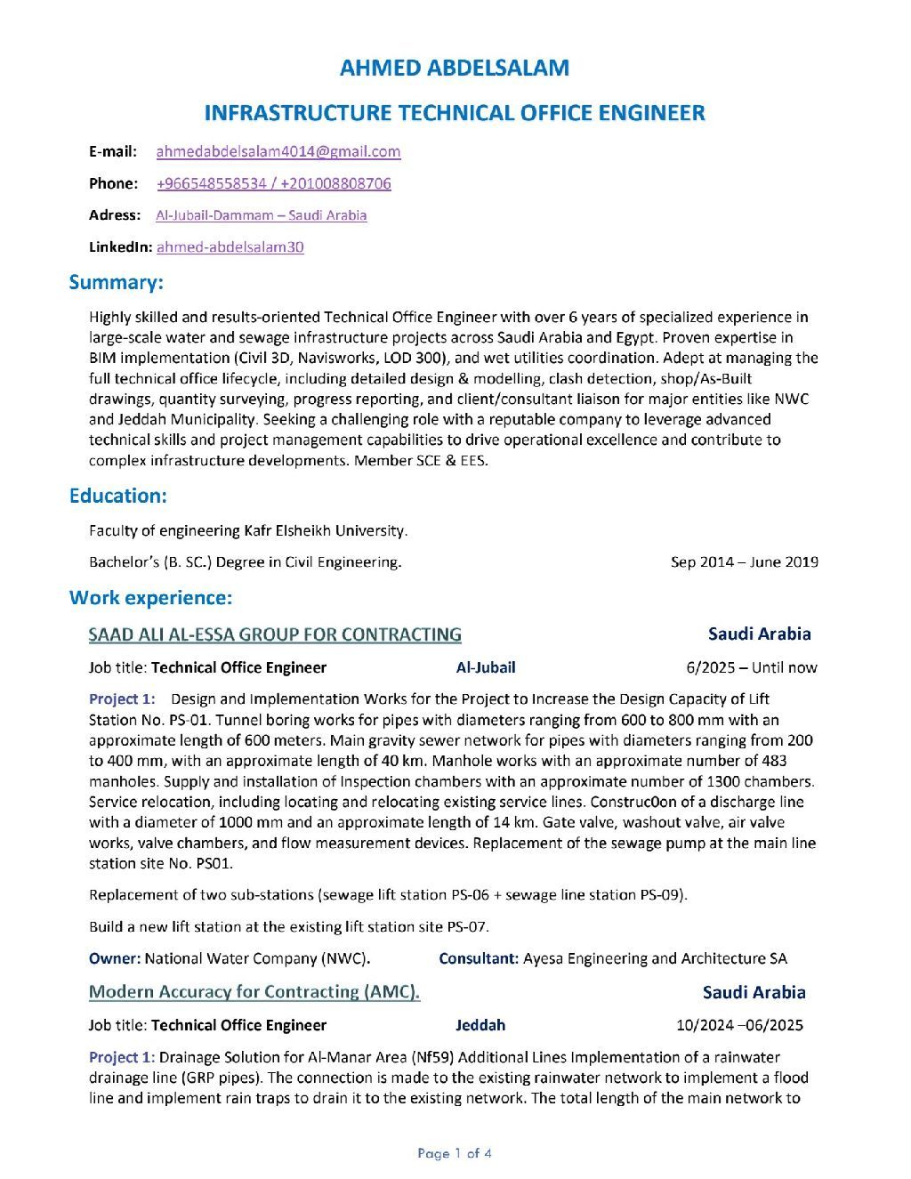مهندس مكتب فني بنية تحتية (Infrastructure Technical Office Engineer) بخبرة 6 + سنوات في شبكات المياه والصرف والسيول (Wet Utilities) خبرة في Civil 3D وNavisworks وBIM (LOD 300) وحصر الكميات وShop Drawings والتنسيق. عملت على مشاريع NWC. إقامة قابلة للنقل Transferable Iqama