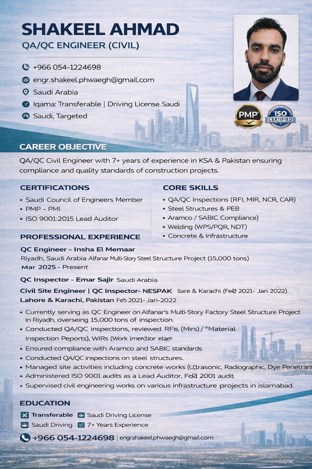 أنا لا ابحث فقط عن وظيفة بل عن فرصة مهنية طويلة الأمد كمهندس جودة مدني QA / QC. امتلك أكثر من 7 سنوات خبرة في السعودية وباكستان في مشاريع الفلل والهياكل الفولاذية والبنية التحتية. حاصل على شهادة PMP ومدقق رئيسي ISO ومسجل لدى الهيئة السعودية للمهندسين. أملك إقامة قابلة للنقل ورخصة قيادة سارية، وجاهز للمباشرة فورا