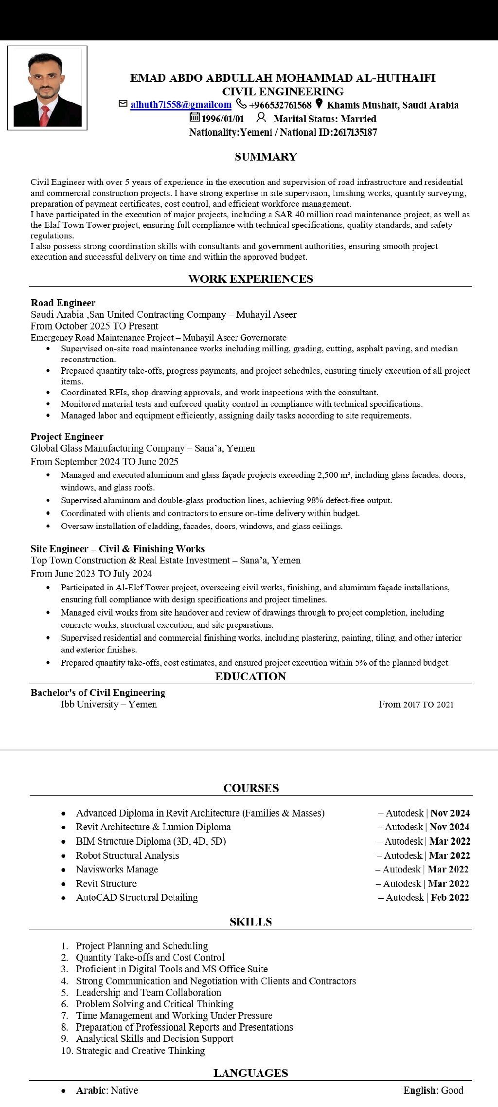 مهندس موقع مدني ابحث عن عمل، أنا المهندس عماد الحذيفي، بخبرة تزيد عن 4 سنوات في مجال مشاريع الهندسة المدنية والاشراف الميداني للعظم والتشطيبات الداخلية والخارجية. لدي خبرة قوية في مراجعة الرسومات التنفيذية، اعداد حصر الكميات (BOQ) متابعة الجداول الزمنية للمشاريع، وضبط الجودة وفق المواصفات الفنية المعتمدة. اقامتي سارية وامتلك رخصة قيادة، متواجد حاليا في الرياض