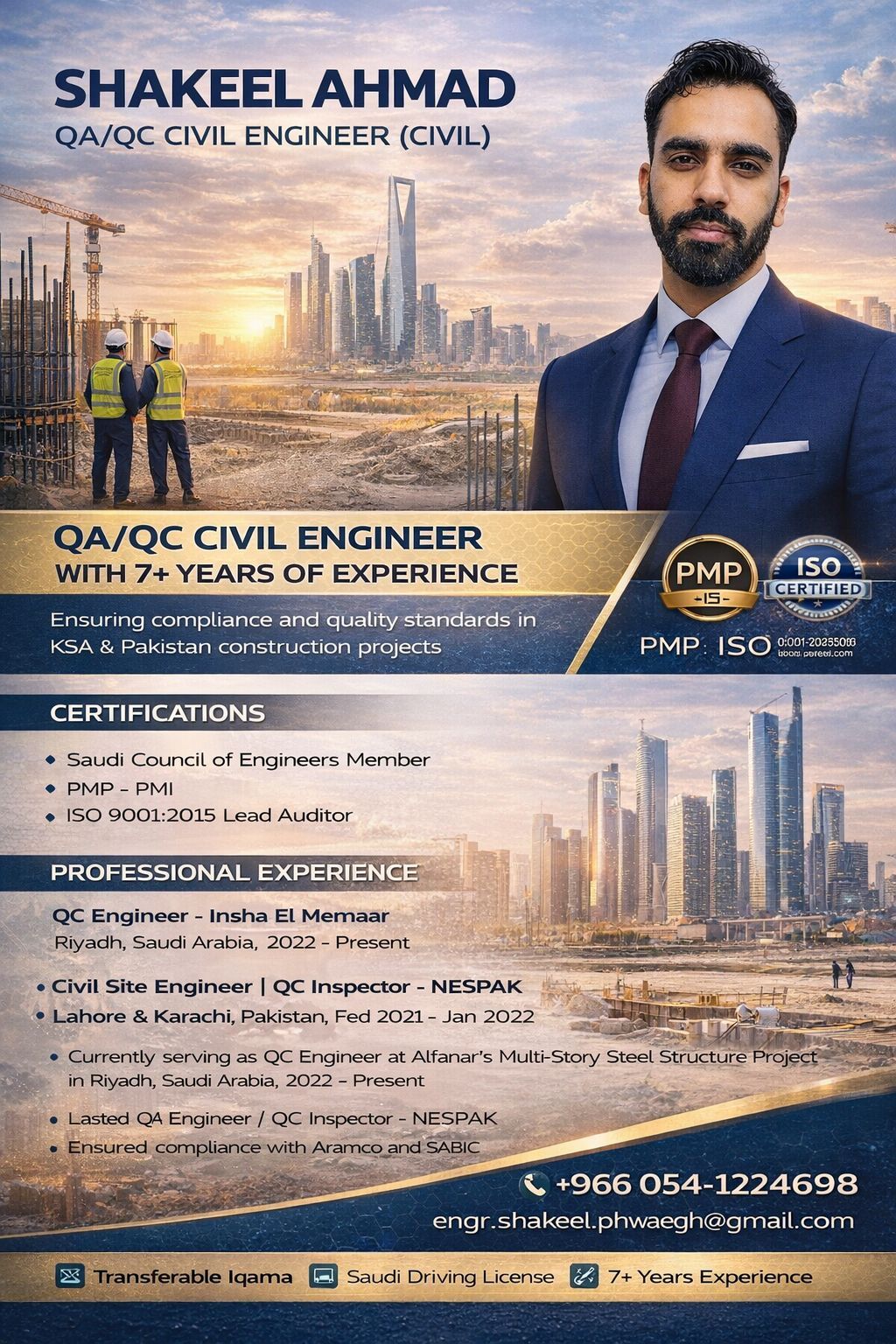 أنا لا ابحث فقط عن وظيفة، بل عن فرصة مهنية طويلة الأمد كمهندس ضبط جودة وموقع مدني، امتلك خبرة تزيد عن 7 سنوات في مشاريع الهياكل الفولاذية والفلل والبنية التحتية في السعودية وباكستان. حاصل على اعتماد الهيئة السعودية للمهندسين وشهادة PMP ومدقق ISO، اضمن الجودة والالتزام. أحمل إقامة قابلة للنقل ورخصة قيادة سعودية وجاهز للانضمام فورا بكفاءة عالية
