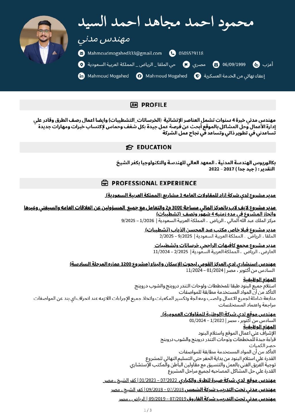 مهندس مدني مدير مشروع تنفيذ، ابحث عن عمل وقد عملت في العديد من مشاريع الخرسانات والتشطيبات كمدير مشروع من ضمنها مشاريع تابعه للراجحي وعبد المحسن الذياب والمركز المالي KAFD وغيرها من المشاريع كما هو موضح بال CV ومتواجد حاليا في الرياض ويوجد رخصة قيادة وإقامة سارية