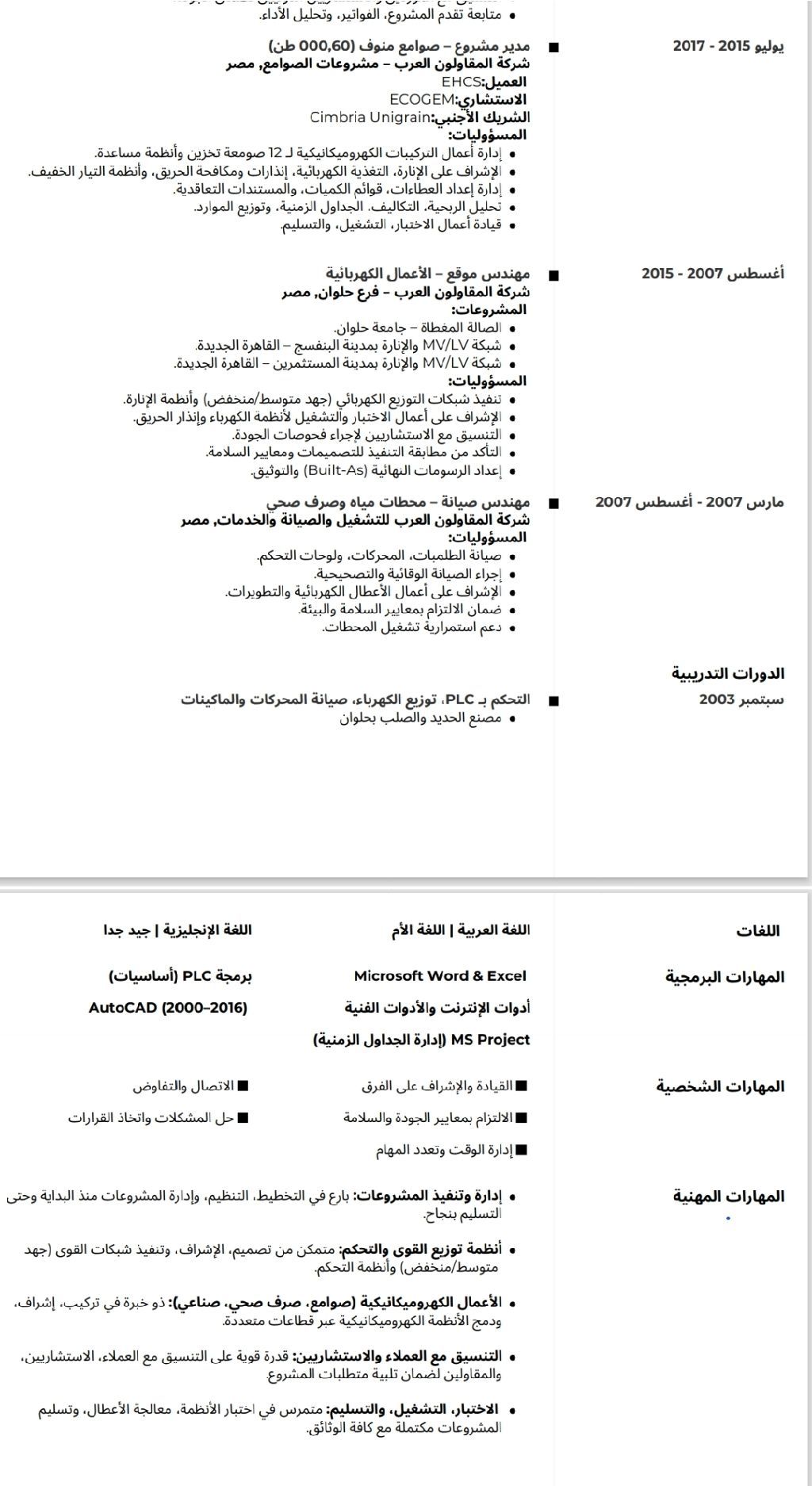 مهندس كهرباء، خبرة 21 عام في أعمال الكهروميكانيك والبنية التحتية والأنظمة المختلفة للتيار الخفيف والشبكات الكهربائية