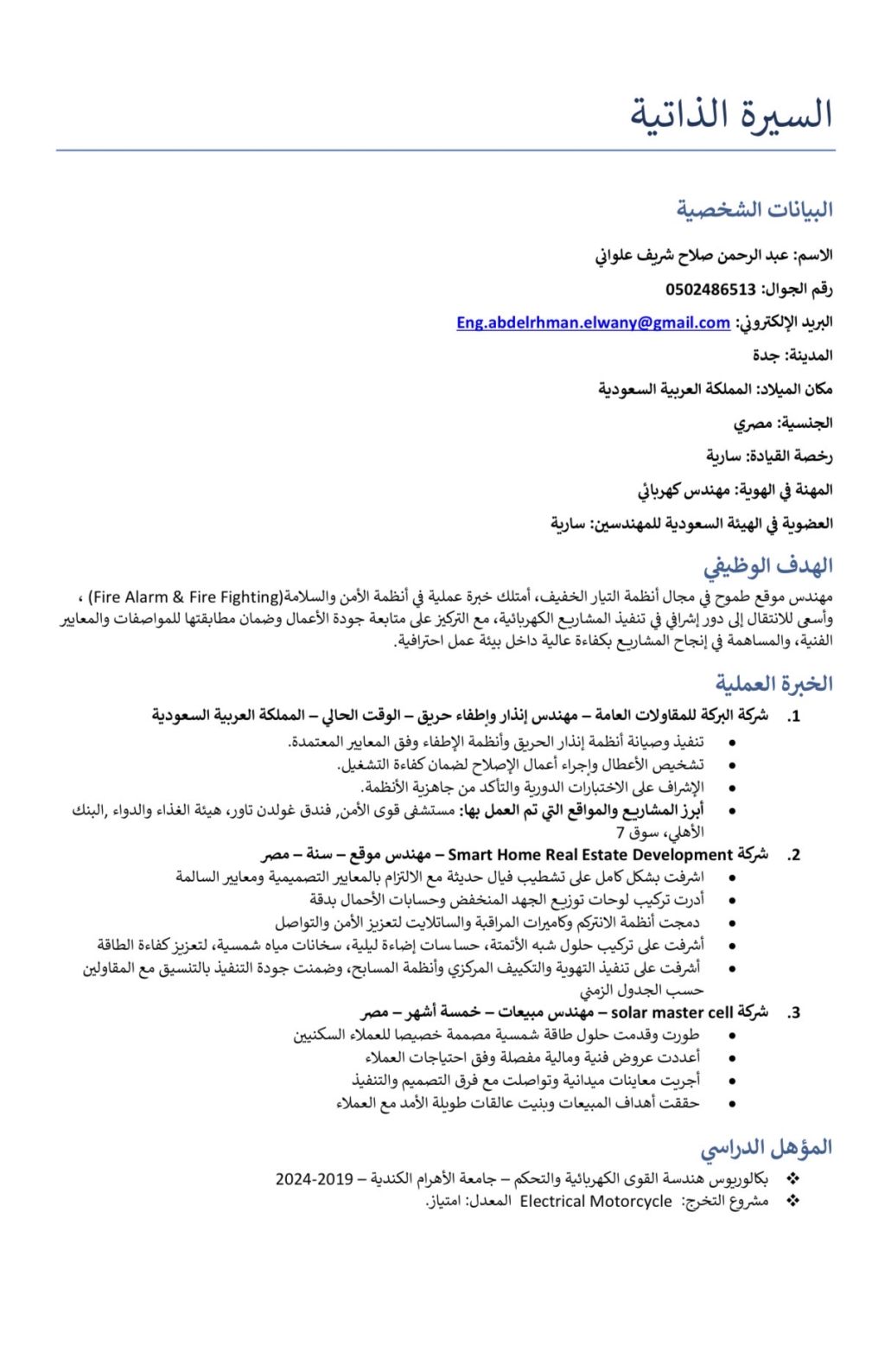 مهندس كهرباء بخبرة في مجال المقاولات، يشمل التنفيذ والاشراف والصيانة. لدي خبرة بأعمال الموقع (تنفيذ - اشراف - تنسيق) قراءة واعتماد المخططات وShop Drawings ابحث عن فرصة عمل مناسبة داخل المملكة