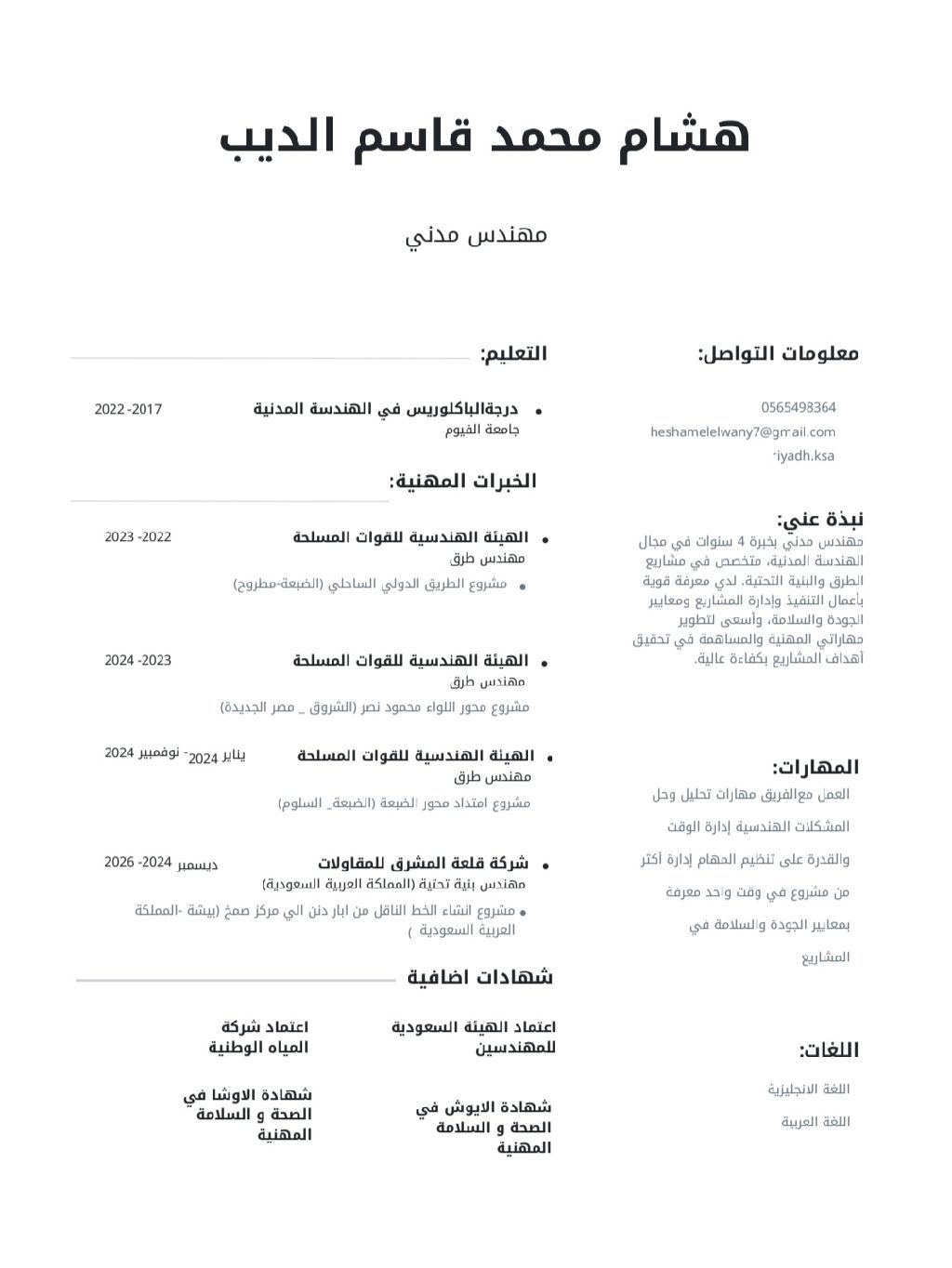 مهندس مدني (طرق وبنية تحتية) مهندس مدني بخبرة تزيد عن 4 سنوات في تنفيذ المشاريع، متخصص في أعمال الطرق والبنية التحتية، وأسعى للانضمام الى شركة مقاولات أو مكتب استشاري داخل المملكة العربية السعودية. اعتماد الهيئة السعودية للمهندسين) الخبرات تنفيذ أعمال الطرق (طبقات الاحلال - الأساس - الاسفلت) الاشراف على أعمال البنية التحتية (شبكات المياه والصرف) متابعة الجودة واستلام الأعمال طبقا للمواصفات