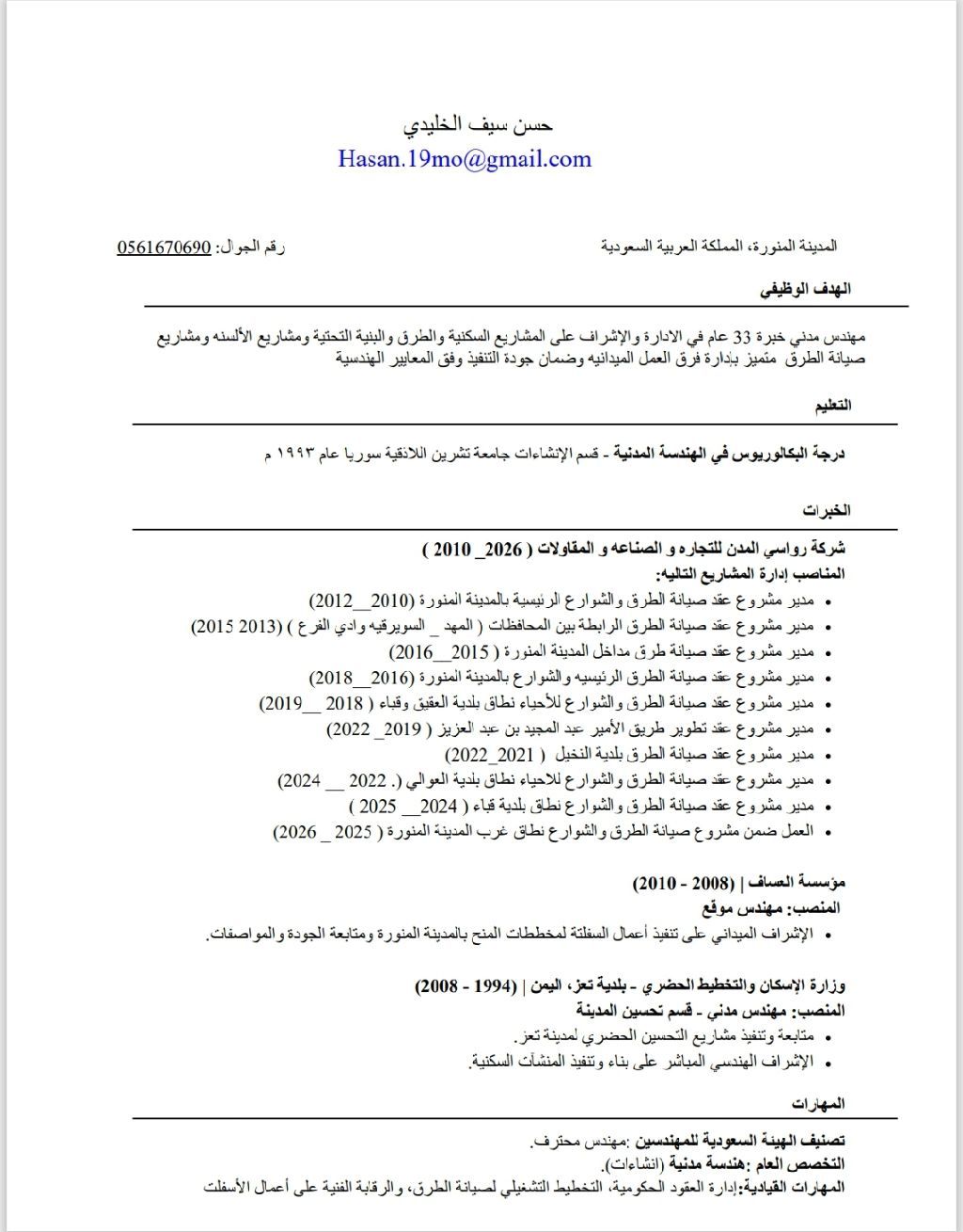 مهندس مدني بخبرة 33 عاما في إدارة والاشراف على مشاريع الطرق والبنية التحتية والمشاريع السكنية. تولي إدارة عدة عقود صيانة وتطوير طرق داخل المدينة المنورة (طرق رئيسية، مداخل، وأحياء) اضافة الى الطرق الرابطة بين المحافظات. يتميز بقيادة الفرق الميدانية معالجة التحديات، تسريع وتيرة الانجاز، وضبط التكاليف ورفع كفاءة الأداء، مع ضمان جودة التنفيذ وفق المعايير وتحقيق استدامة المشاريع. جاهز للعمل فورا
