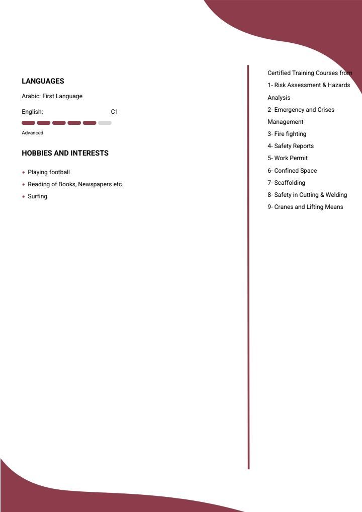 مشرف أمن سلامة مهنية خبرة 3 سنوات في المواقع الانشائية اعمل علي تقيم المخاطر وأعاد التقارير والعمل علي المرتفعات التعمل المخاطر والحرائق سرعة اتخاذ القرار حاصل علي الاوشا الأمريكية وحاصل علي دوره تدريبية من الادارة الدولية للصحة والسلامة واخضائي صح والسلامة المهنشهادة الاسعاف الأولية الاضافة الى 14 شهادة معتمده + 2 كأردنيه حاصل علي بكالوريوس نظم المعلومات ودور تدريبية من معاهد الصحة والسلامة المهنية