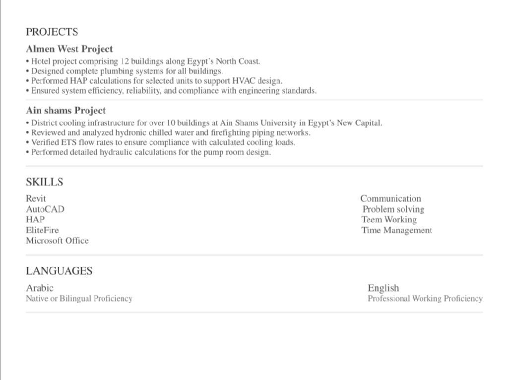 أنا مهندس تصميم ميكانيكي متخصص في أنظمة التدفئة والتهوية وتكييف الهواء والسباكة ومكافحة الحرائق، ولدي خبرة تزيد عن ثلاث سنوات في هذا المجال، وذلك في مشاريع واسعة النطاق. أستخدم برامج Revit وAutoCAD وHAP، والتزم بمعايير ASHRAE وNFPA وBS EN وSBC. لدي مهارات عالية في تنسيق نمذجة معلومات المباني (BIM) والحسابات الهيدروليكية، وتحليل الطاقة. أقيم في الرياض، ومتاح للعمل فورا