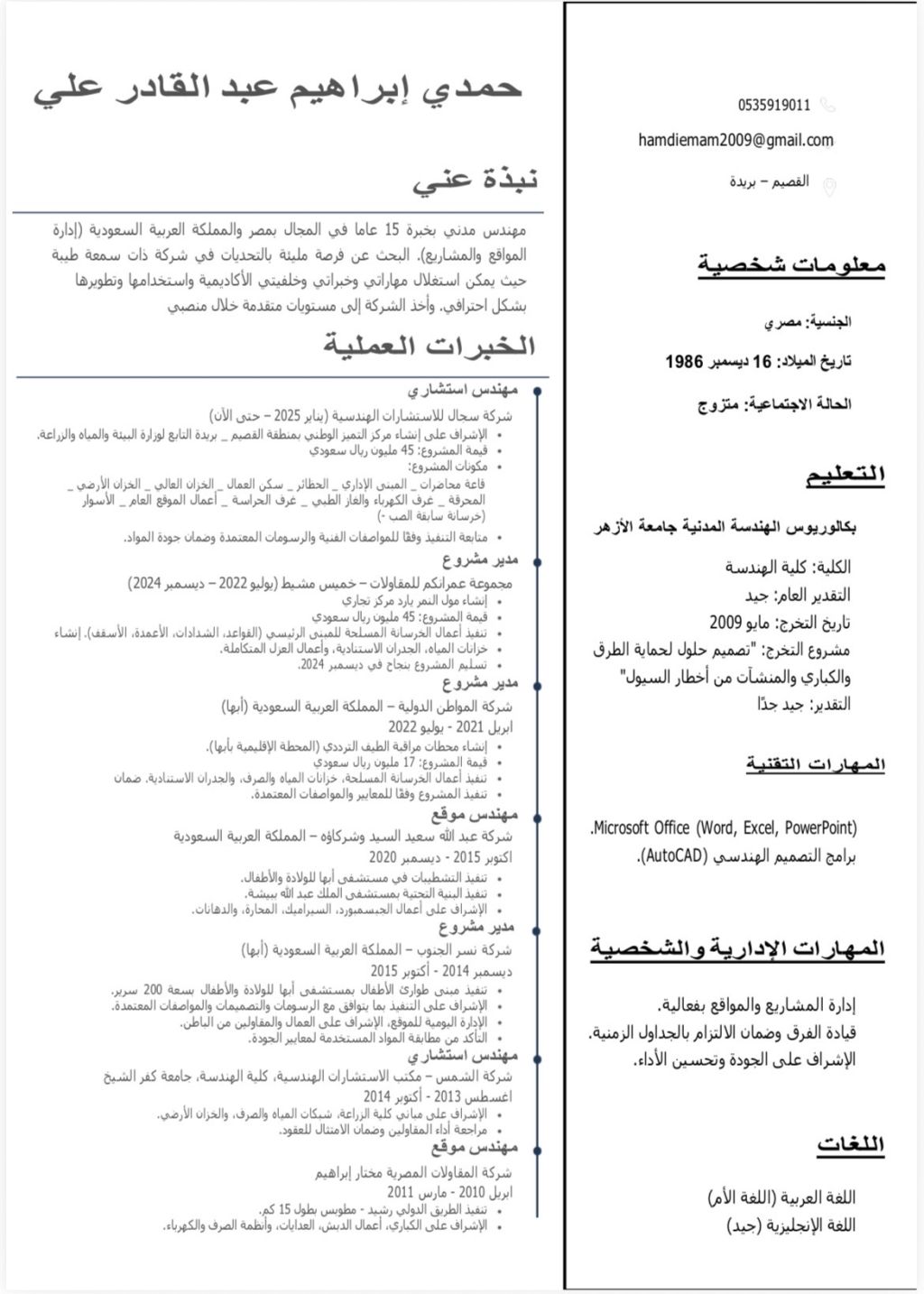 م حمدي إبراهيم مهندس مدني (مدير مشروع) مسجل بالهيئة السعودية للمهندسين متواجد بالمملكة العربية السعودية إقامة سارية قابلة للنقل جاهز للالتحاق بالعمل مباشرة