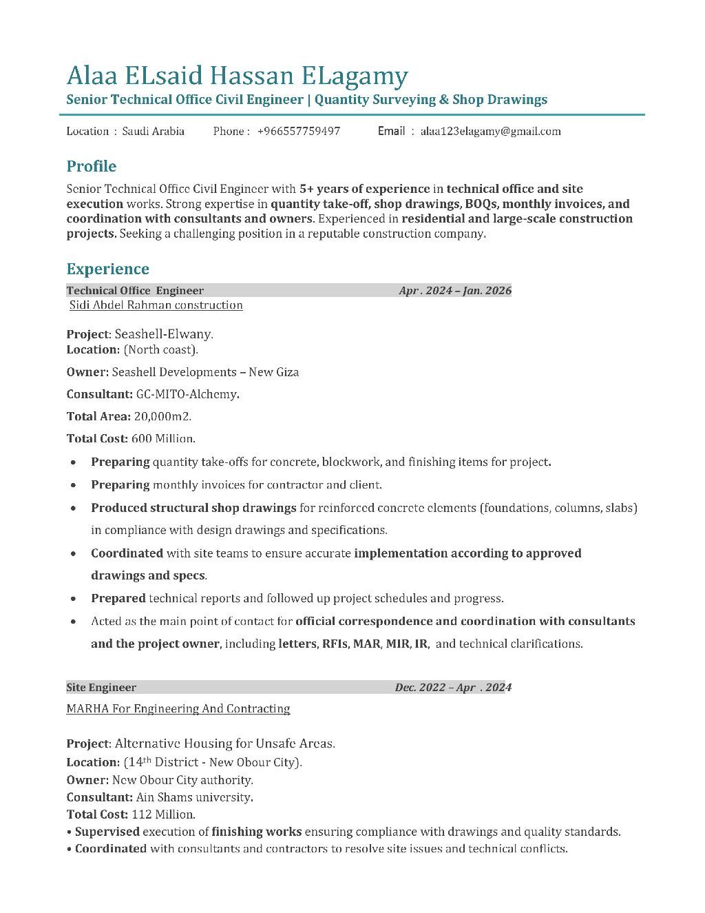 مهندس مدني خبرة 5 سنوات في أعمال الموقع والمكتب الفني لدي خبرة عملية في متابعة وتنفيذ كافة أعمال الموقع خرسانات وتشطيبات، كذلك مراجعة المخططات التنفيذية، اعداد Shop Drawings، حصر الكميات، اعداد المستخلصات للمالك والمقاولين، والتنسيق مع الاستشاري وفرق التنفيذ لضمان سير العمل طبقا للمواصفات والجداول الزمنية. متواجد حاليا في المملكة العربية السعودية وجاهز للعمل فورا