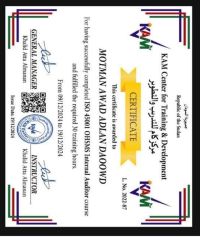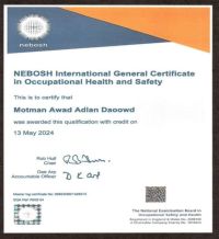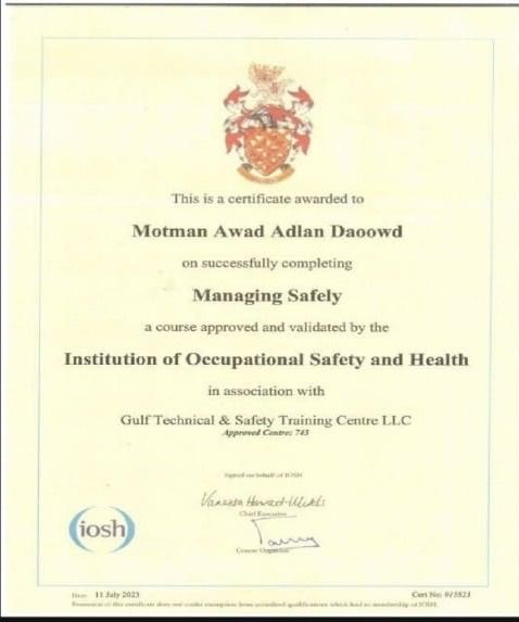 مهندس سلامة وصحة مهنية بكالوريوس هندسة خبرة واسعة في الأمن والسلامة في شركة استشارية وشركة مقاولات تصنيف أول خبرة في مشاريع البنيه التحتية والصناعات حاصل علي اعتمادات شركة المياه الوطنية NWC في منطقتين (الباحة وعسير) واعتماد شركة تطوير المباني TBC حاصل علي شهادة النيبوش والايوش والاوشا والأيزو 45001 وشهادة اسعافات أولية من الهلال الأحمر