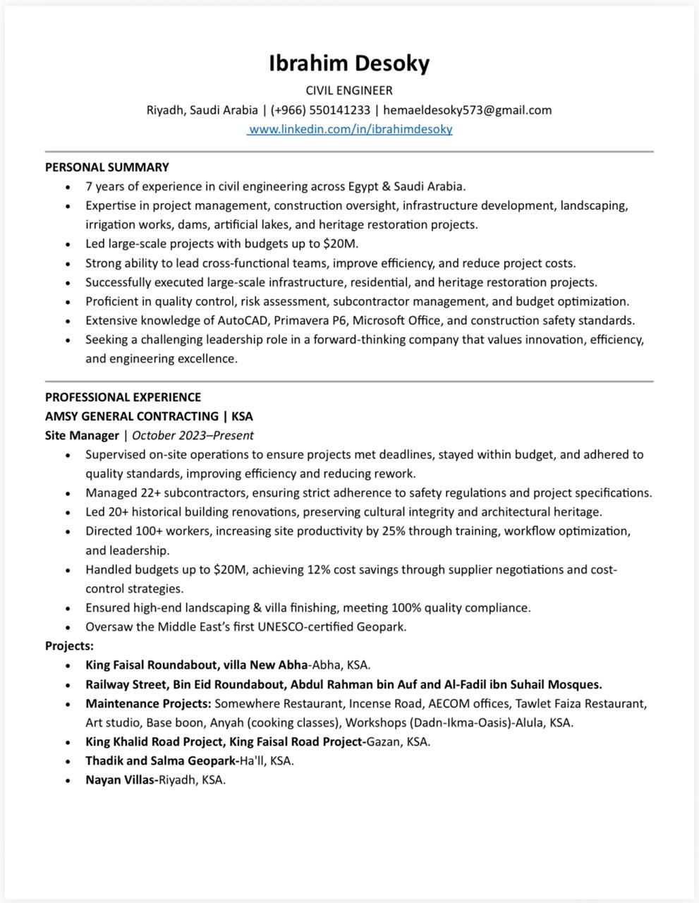 مهندس مدني خبرة 7 سنوات في التنفيذ والاشراف وإدارة المشاريع حاصل علي PMP وعملت مع العديد من الهيئات والشركات الكبيرة والأمانات لدي خبرة في أعمال البنية التحتية التشطيبات الخرسانة والأساسات إدارة الموقع والتنسيق مع الاستشاري اعداد التقارير ومتابعة الجودة عمل الجداول الزمنية المعتمدة حساب تكاليف المشاريع والتسعير اجادة استخدام AutoCAD - Excel - Primavera P6