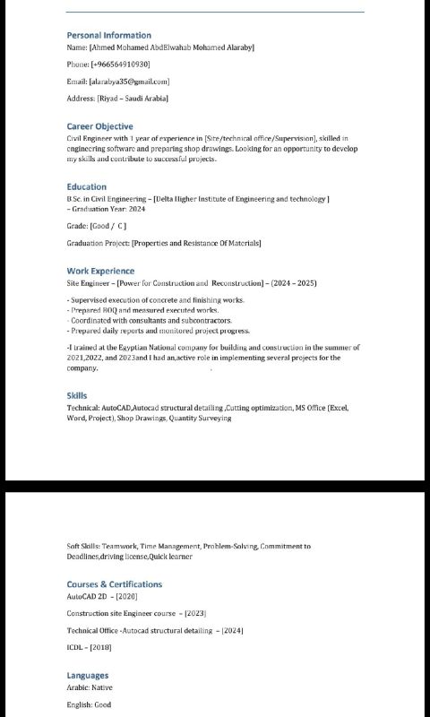 مهندس مدني موقع خبرة في تنفيذ جميع البنود عظم وتشطيبات ومراجعة المخططات وحساب الكميات BOQ وQuality control وممتاز في استخدام برنامج AutoCAD. ASD. MS وحاصل علي الرخصة الدوليه لقيادة الحاسوب ICDL ومتاح نقل كفالة والعمل في أي مكان بالمملكة