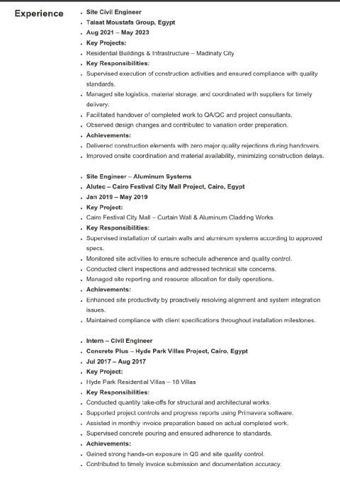 مهندس مدني خبرة 10 سنوات، جاهز للعمل الفوري، منها 6 سنوات في المملكة العربية السعودية. أتمتع بخبرة قوية في إدارة المشاريع، الاشراف على المواقع، والتنسيق لأعمال الهندسة المدنية، بما في ذلك، الخرسانات والتشطيبات للمباني. مشاريع البنية التحتية، شبكات الصرف الصحي، مياه الأمطار