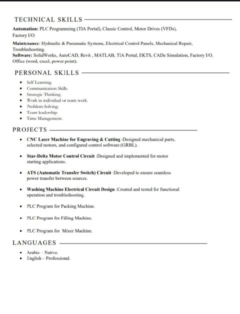 مهندس ميكاترونكس بخبرة في الصيانة الصناعية والأتمتة. خبرة في تشخيص أعطال المعدات الميكانيكية والكهربائية وخطوط الانتاج، صيانة المحركات ولوحات التحكم، برمجة PLC باستخدام Siemens TIA Portal، التعامل مع HMI وأنظمة VFD، وتنفيذ دوائر التحكم مثل Star - Delta وATS خبرة في الهيدروليك والنيوما تيك والصيانة الوقائية والتصحيحية. متاح للعمل فورا