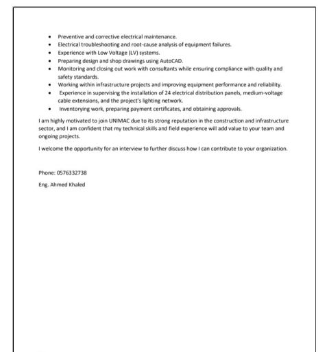أتقدم بطلب التوظيف في وظيفة مهندس معماري في جهتكم. أجد نفسي مؤهلا لهذه الوظيفة بفضل خبرتي ومهاراتي في مجال الهندسة المعمارية أجيد جميع البرامج الهندسية و