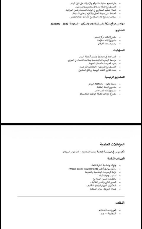 مهندس مدني مقيم في السعودية اجادة برامج التحليل والتصميم الانشائي اجادة العمل على منصة خبرة اجادة العمل على منصة بلدي اجادة العمل على منصة سلامة خبرة عملية في ادارة المشاريع والاشراف والتنفيذ القدرة على حساب الكميات والمواصفات للمشاريع خبرة في عمل مخططات الأمن والسلامة وتقارير السلامة اصدار تراخيص الدفاع المدني اصدار تراخيص الأنشطة التجارية تقييم الأضرار الانشائية للمباني وحصرها وتسعيرها