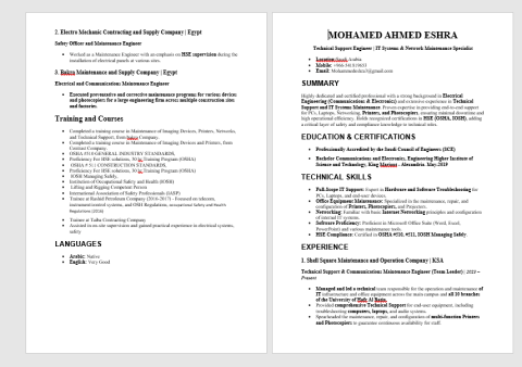 I am writing to express my strong interest in a position related to Electrical, Network Maintenance, or IT Technical Support Engineering. With over six years of experience in electrical systems, telecommunications, and IT network maintenance, I have developed a solid foundation in managing, maintaining, and optimizing technical infrastructure to ensure smooth and efficient operations. Througho