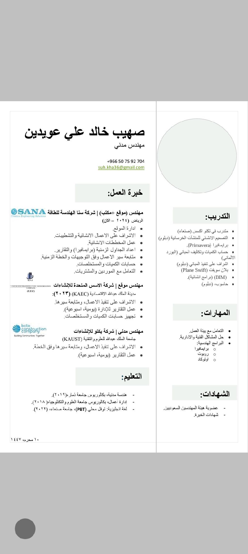 مهندس مدني، خبرة 6 سنوات (موقع، مكتب) عضو الهيئة السعودية للمهندسين، رخصة قيادة، لغة انجليزية