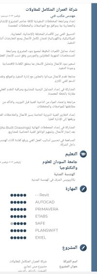 A civil engineer classified by the Saudi Council of Engineers. experience in concrete works, implementaion of concrete and metal structures, concrete testing works, tests, road works, finishing works, experience in structural design on engineering programs, implementing and understanding plans, I have a driving license and a car and I am ready to work throughout the kingdom
