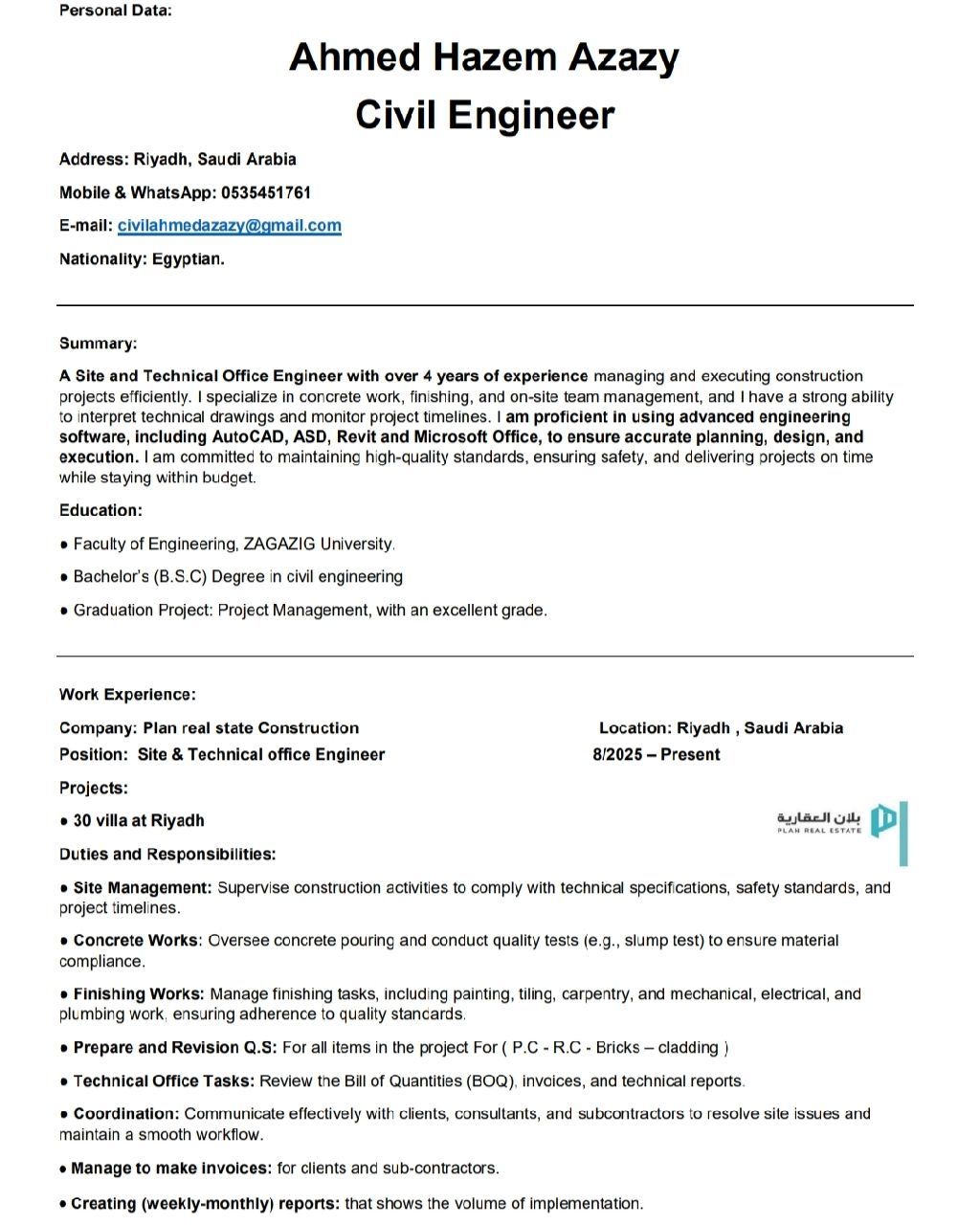 I am Civil engineer located in riyad in Saudi Arabia. I worked in NEOM, implementing mountain water pumping stations. Graduate of a government university, class of 2022. Experience in technical office work, implementation, shop drawing, AutoCAD, ASD, and Revit programs. I am looking for a job opportunity within the Kingdom of Saudi Arabia