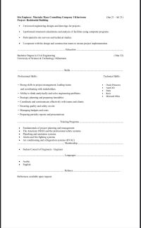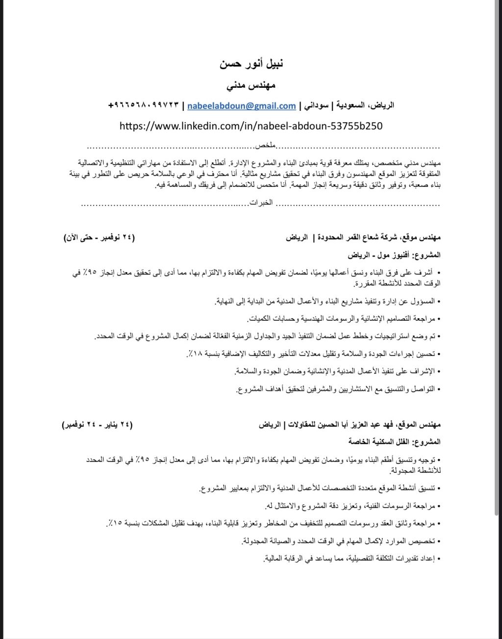 مهندس مدني سوداني الجنسية، العمر 26 خبرة 4 سنوات اشراف (هياكل وتشطيبات) ومكتب (حساب كميات وتسعير) وعلى دراية بالبرامج الهندسية ومعرفة وعلاقات واسعة بسوق العمل والموردين. يحضر ماجستير مصغر عن خدمات المباني بعدد كورسات 18 دورة بعدد 680 ساعة، واجتاز دورات السباكة والصرف الصحي والاوشا الأمريكية وأنظمة الانذار ومكافحة الحرائق ودورة تخطيط وادارة المشاريع