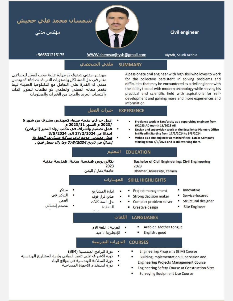 I am a civil engineer, good at structural design and supervision, as well as sorting real estate units. I would like to apply for a vacant position. Applicant/ Shamsan Muhammad Ali Juhaish