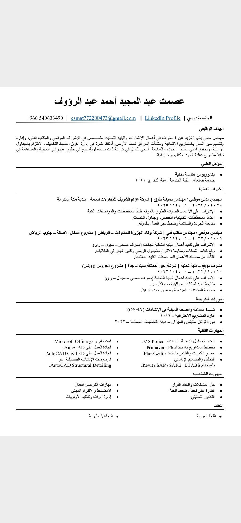 Civil engineer with 5 years of experience in site supervision and execution of construction works (structural work, finishing, renovations) for private, commercial, and NHC housing projects. Responsibilities include quantity surveying, report preparation, payment certificate preparation, and scheduling. Proficient in all execution and project management software. Experienced in subcontractor manag