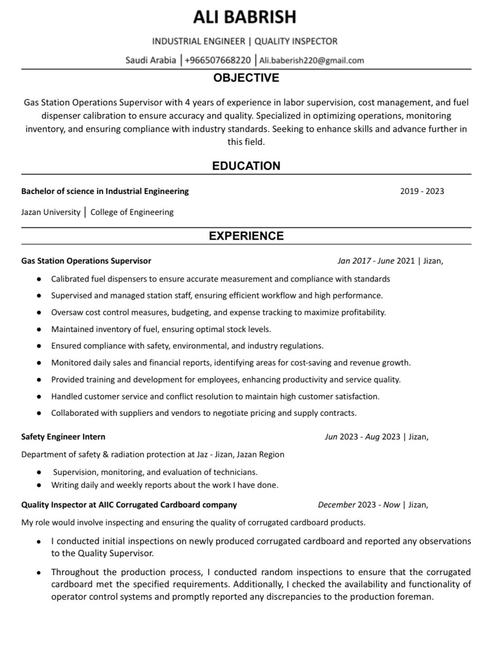 مهندس جودة وانتاج وعملت في أكثر من وظيفة منها ادارة عمليات نقل لمحطات الوقود بالاضافة الى ادارة فريق مكون من 45 عامل باضافة الى ادارة مواد الغذائية بالاضافة مهندس جودة في مصنع لضمان جودة منتجات وتقليل تكلفة الانتاج