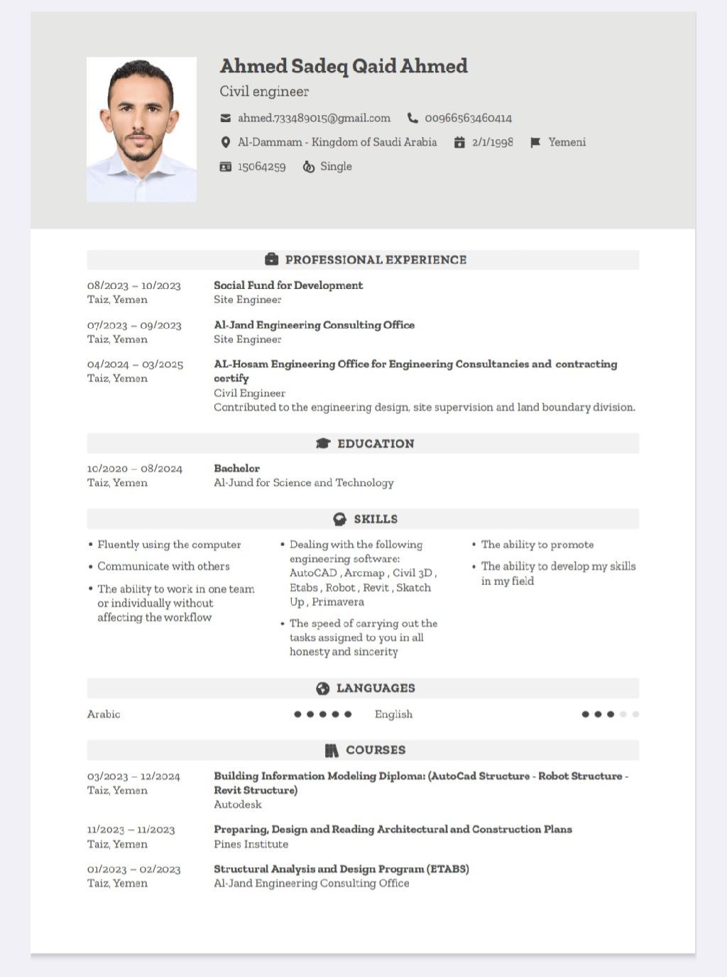 Civil Engineer, Site Engineer, I have BIM certificates from Autodesk in Robotics and Revit in Quantity Surveying, Shop Drawing, Project Management in Primavera and Surveying