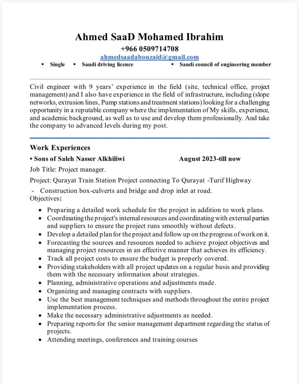 Civil engineer with nine years of experience in construction, including execution, technical office work, quantity surveying, site management, and infrastructure fields such as sewer networks, lifting stations, treatment plants, as well as roads and bridges. I am seeking a genuine job opportunity