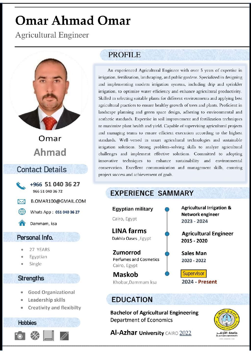 I am Eng. Omar Ahmad Omar, a non - Saudi agricultural engineer currently residing in the Kingdom of Saudi Arabia. I am actively seeking a job opportunity in the agricultural sector. I bring over 1 year of experience in Irrigation and fertilization systems - Landscaping and plant care - Agricultural project and public garden management - Working in challenging climates and saline soils