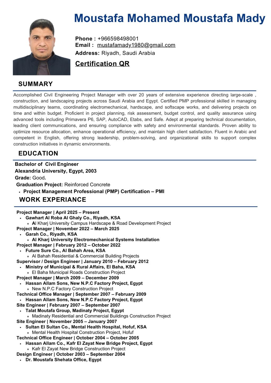 مهندس مدني متخصص في جميع أعمال الإنشاءات واللاند سكيب - مصري الجنسية - خبرة أكثر من 20 سنة بأعمال إدارة المشاريع والتخطيط والمتابعة والجداول الزمنية والتنفيذ والمكتب الفني والاشراف على التنفيذ والدراسات الفنية والمالية، موجود في الرياض، ومتاح للعمل فورا بأي مكان بالمملكة