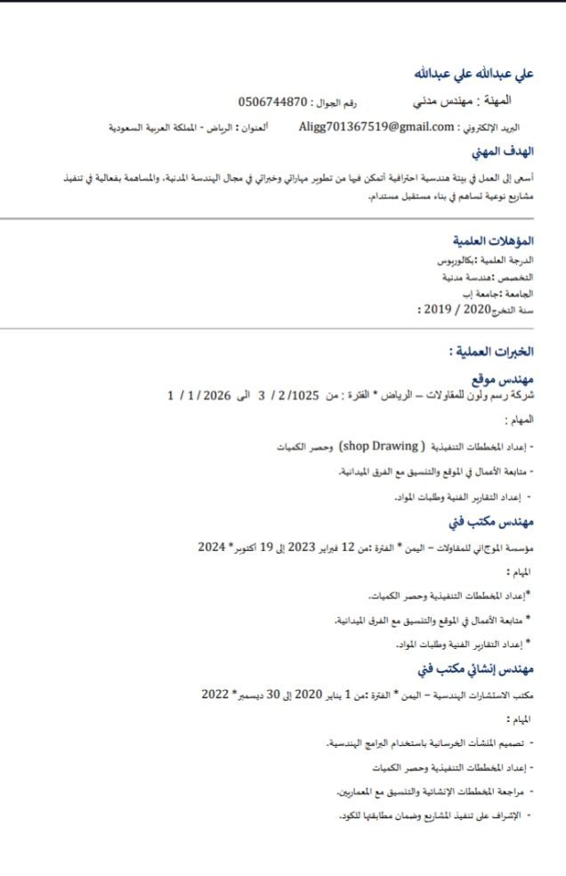 مهندس مدني خبرة ست سنوات في التصميم الانشائي وأعمال المكتب الفني وكذلك الاشراف الموقعي على جميع مراحل تنفيذ المشروع (أعمال الهيكل الخرساني والمعدني وأعمال التشطيبات) وحساب الكميات واعداد المخططات التنفيذيه الشوبنج دراونج واعداد التقارير الفنيه وحل المشكلات الفنيه والاداريه التي قد تواجه المشروع ومتقن للبرامج الهندسيه. معتمد من الهيئة السعودية للمهندسين وعندي إقامة سارية. ورخصة قيادة