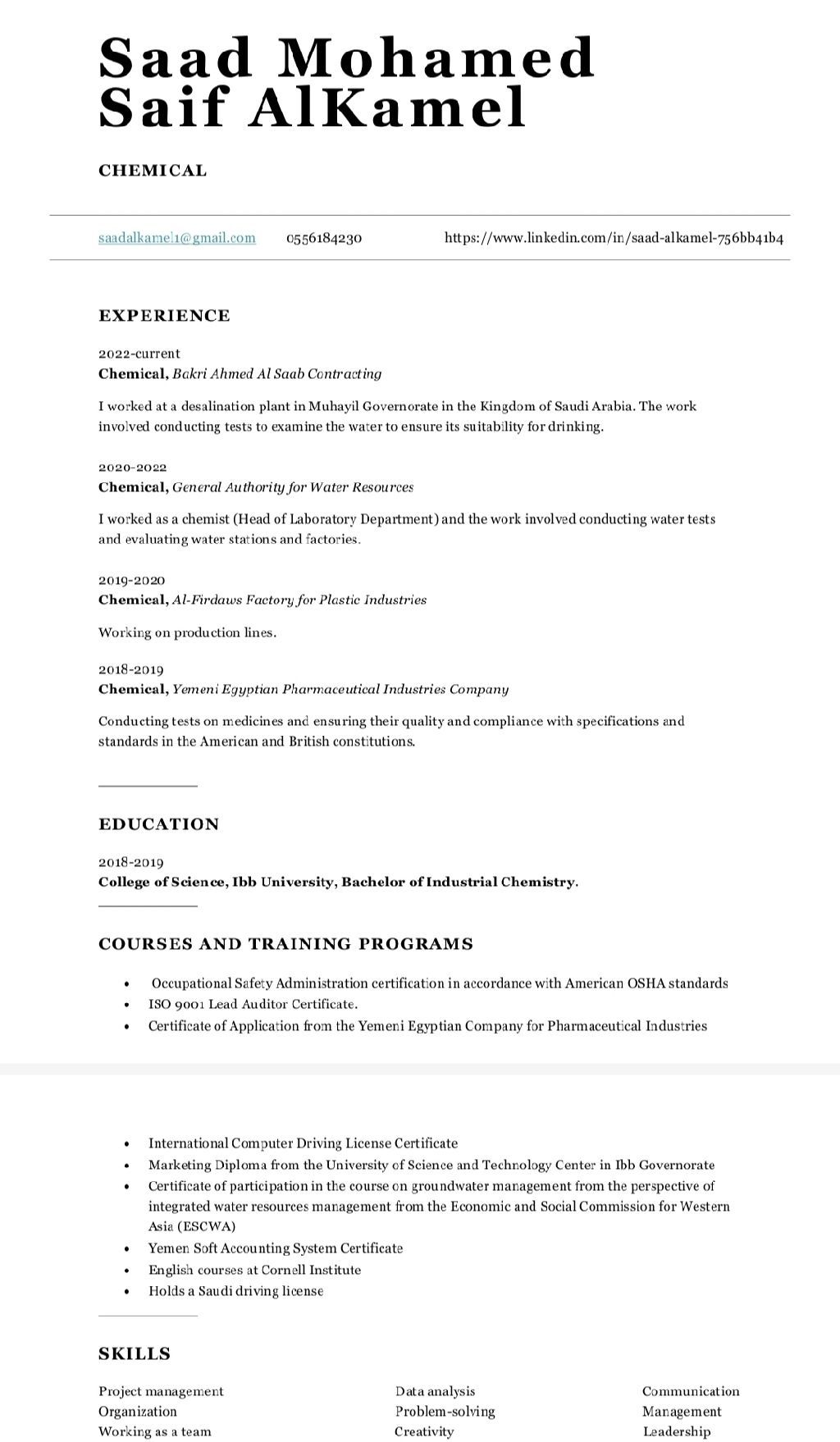 كيميائي ابحث عن فرصة عمل مناسبة في مجال تخصصي أو في المجالات ذات الصلة حاصل على بكالوريوس كيمياء صناعية وحاصل على شهادة الاوشا والأيزو 90001 ISO امتلاك خبرة في الأمن والسلامة وامتلاك خبرة في مصانع المياه ومحطات تحلية وفي مصانع لبلاستيك واختبارات المياه الكيميائية والميكروبيولوجية والفيزيائية