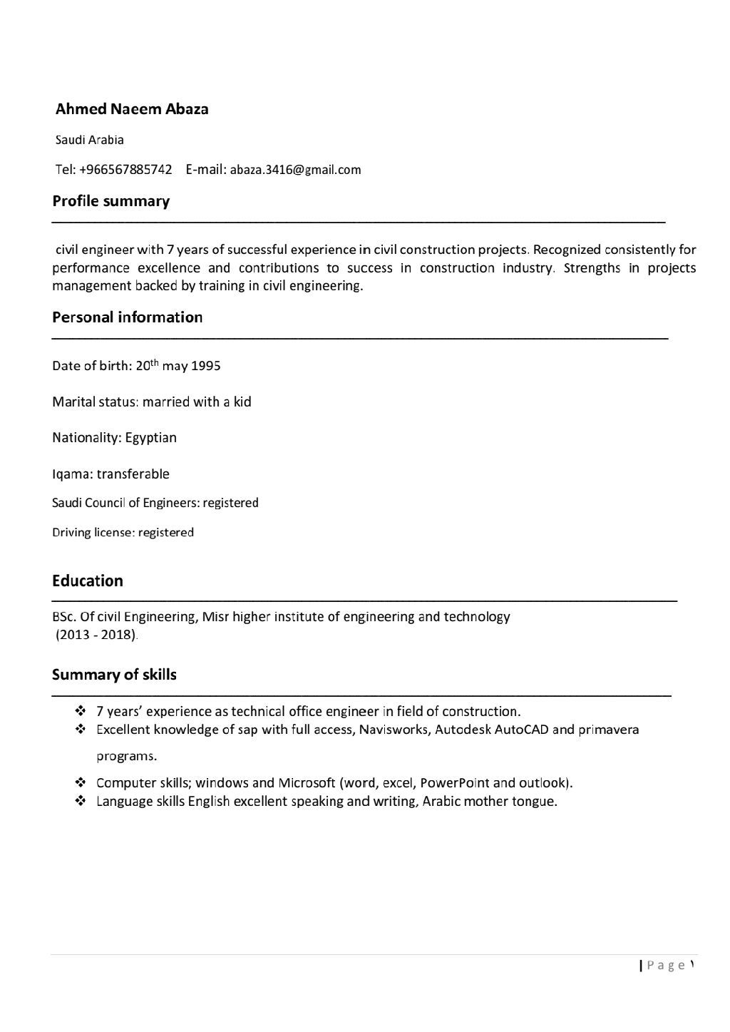 مهندس مدني خبرة أكثر من سبع سنوات كمهندس تنفيذ في أعمال الخرسانات والتشطيبات وأعمال البنية التحتية، وخبرة في أعمال المكتب الفني وعلى دراية بجميع البرامج الهندسية (كاد - ريفيت - أوفيس بريما فيرا) واعداد كافة التقارير الفنية واعداد المستخلصات، إقامة سارية وأحمل رخصة قيادة، معتمد من الهيئة السعودية للمهندسين، جاهز للعمل فورا