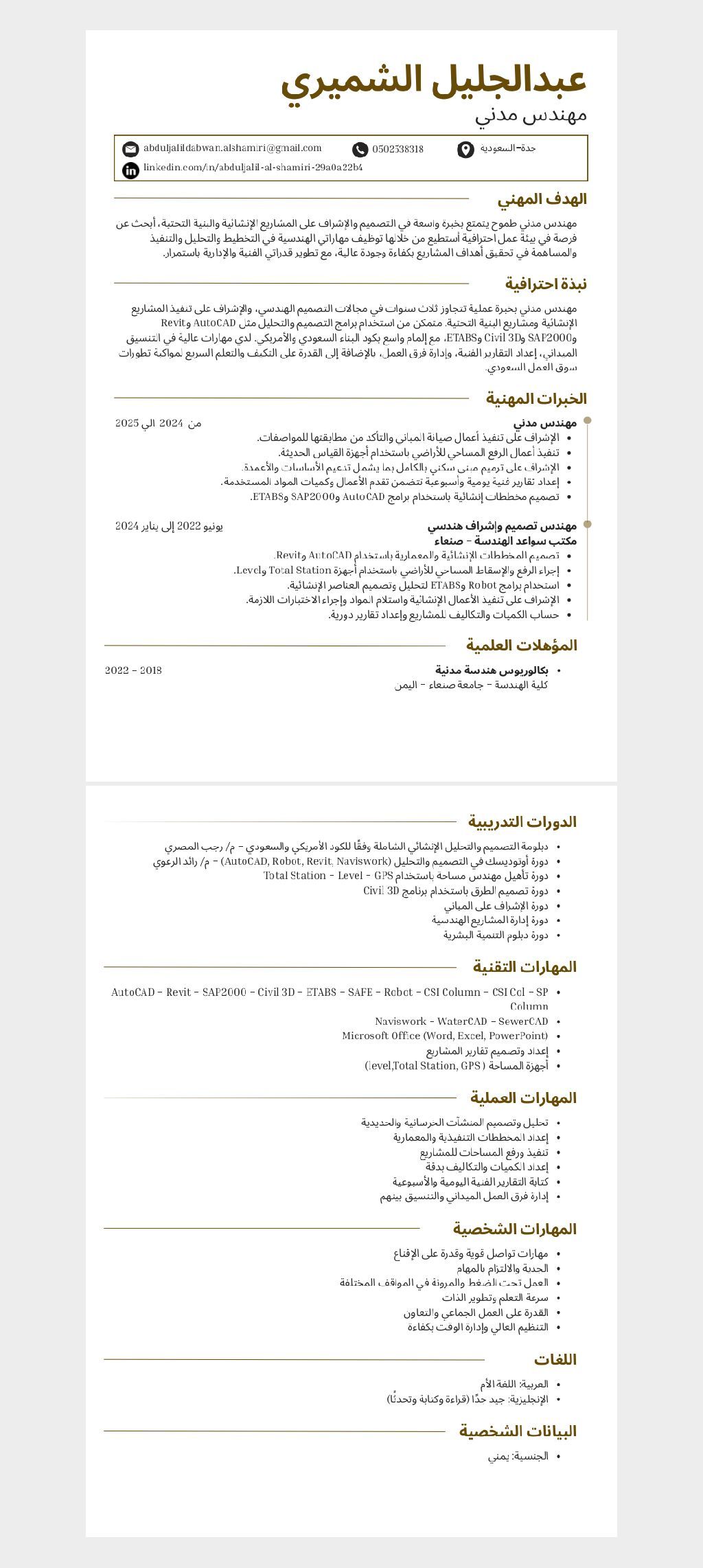 An ambitious civil engineer with extensive experience in the design and supervision of construction and infrastructure projects. I am seeking an opportunity in a professional work environment where I can apply my engineering skills in planning, analysis, and execution, and contribute to achieving project goals with high efficiency and quality, while continuously developing mytechnical and manageri