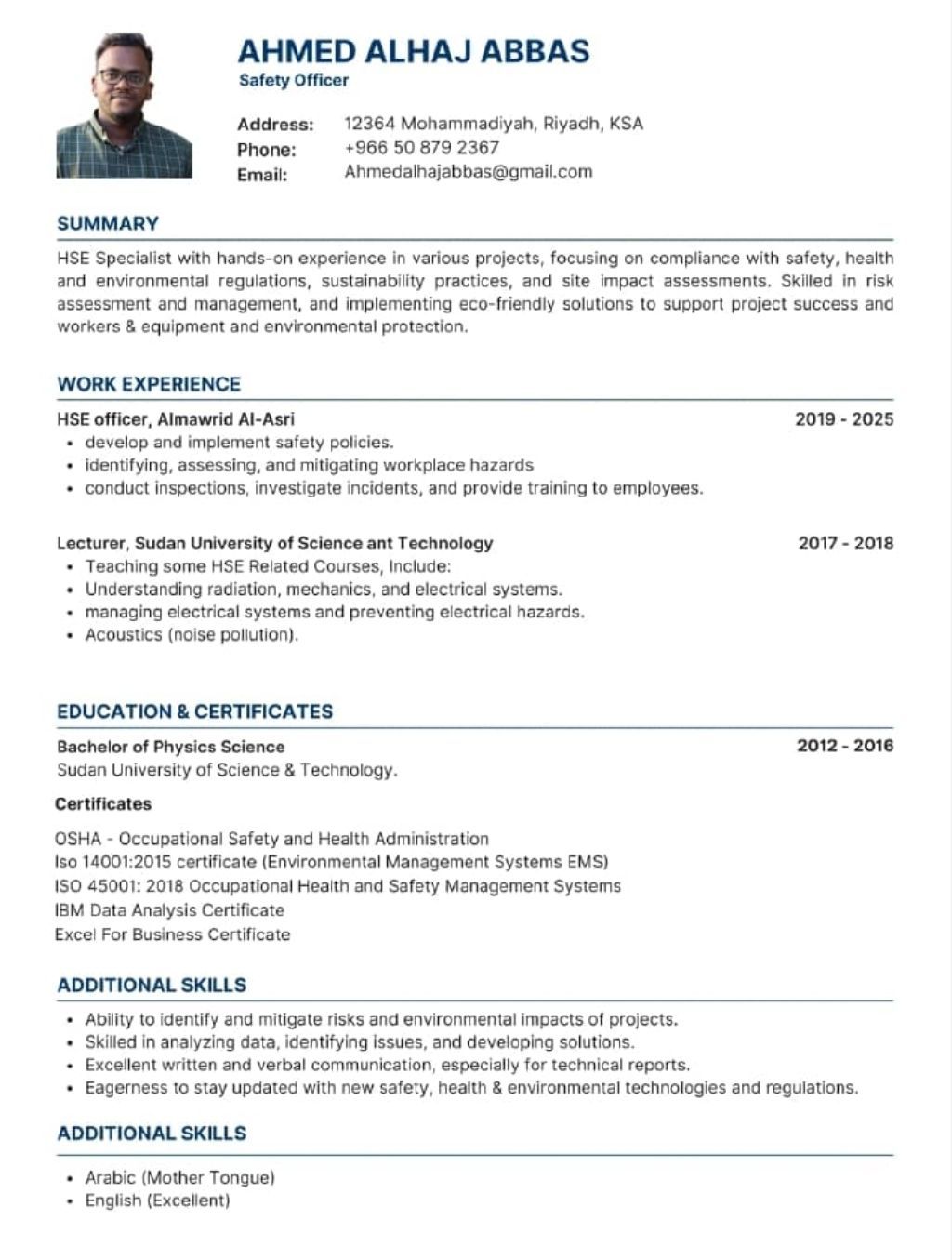 مهندس صحة وسلامة مهنية. حاصل على شهادات دولية عدة مثل ايوش وأيزو. لدي خبرة طويلة في المجال. من وضع خطط وسياسات المتعلقة السلامة والبيئة. وعمل تقييم المخاطر والتفتيش والتدقيق للتأكد من الالتزام بمعايير السلامة الدولية والقوانين المحلية. اصدار تصاريح العمل ومتابعة المهام الهطرة وعمل تقارير الأمن والسلامة الدورية وتقارير التدقيق. بجانب خبرة في الم جاب البيئي. وإدارة النفايات والهاوسكيبنج