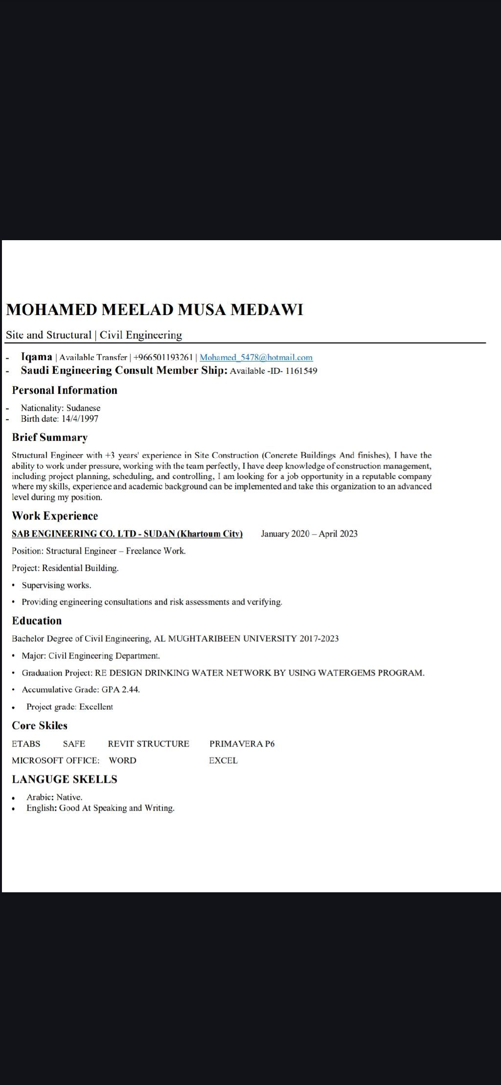 مهندس مدني بخبرة 3 سنوات كمهندس موقع، تنفيذ ومكتب فني، متخصص في أعمال العظم والتشطيبات، والبرامج الهندسية (Revite, AutoCAD, MS, ETABS, Saf Primavira p6) ملم بكود البناء السعودي واشتراطاته، متوفر رخصة قيادة وإقامة سارية قابلة للنقل
