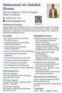 ELV ICT Engineer. Specialized in CCTV, fire alarm systems, Access Control Systems and network extensions. With 7 years of experience in design, implementation and supervision, I am looking for a suitable job opportunity in Saudi Arabia. Ready to work as an ELV/ ICT Engineer, Project Coordinator and ELV Supervisor. I can work under pressure and according to the highest standards Possible in role