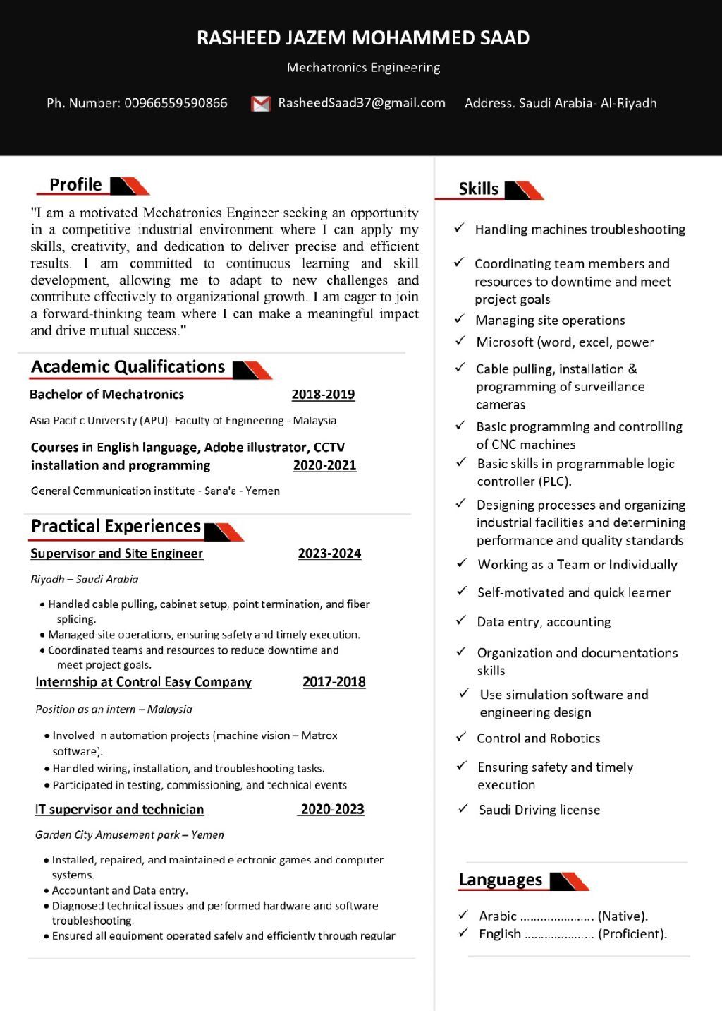 أنا مهندس ميكاترونيك متحمس، ابحث عن فرصة في بيئة صناعية تنافسية، حيث أوظف مهاراتي وابداعي وتفانيي لتحقيق نتائج دقيقة وفعالة. التزم بالتعلم المستمر وتطوير مهاراتي، مما يتيح لي التكيف مع التحديات الجديدة والمساهمة بفعالية في نمو المؤسسة. أتطلع للانضمام الى فريق عمل طموح، حيث يمكنني أحداث تأثير ايجابي وتحقيق نجاح متبادل