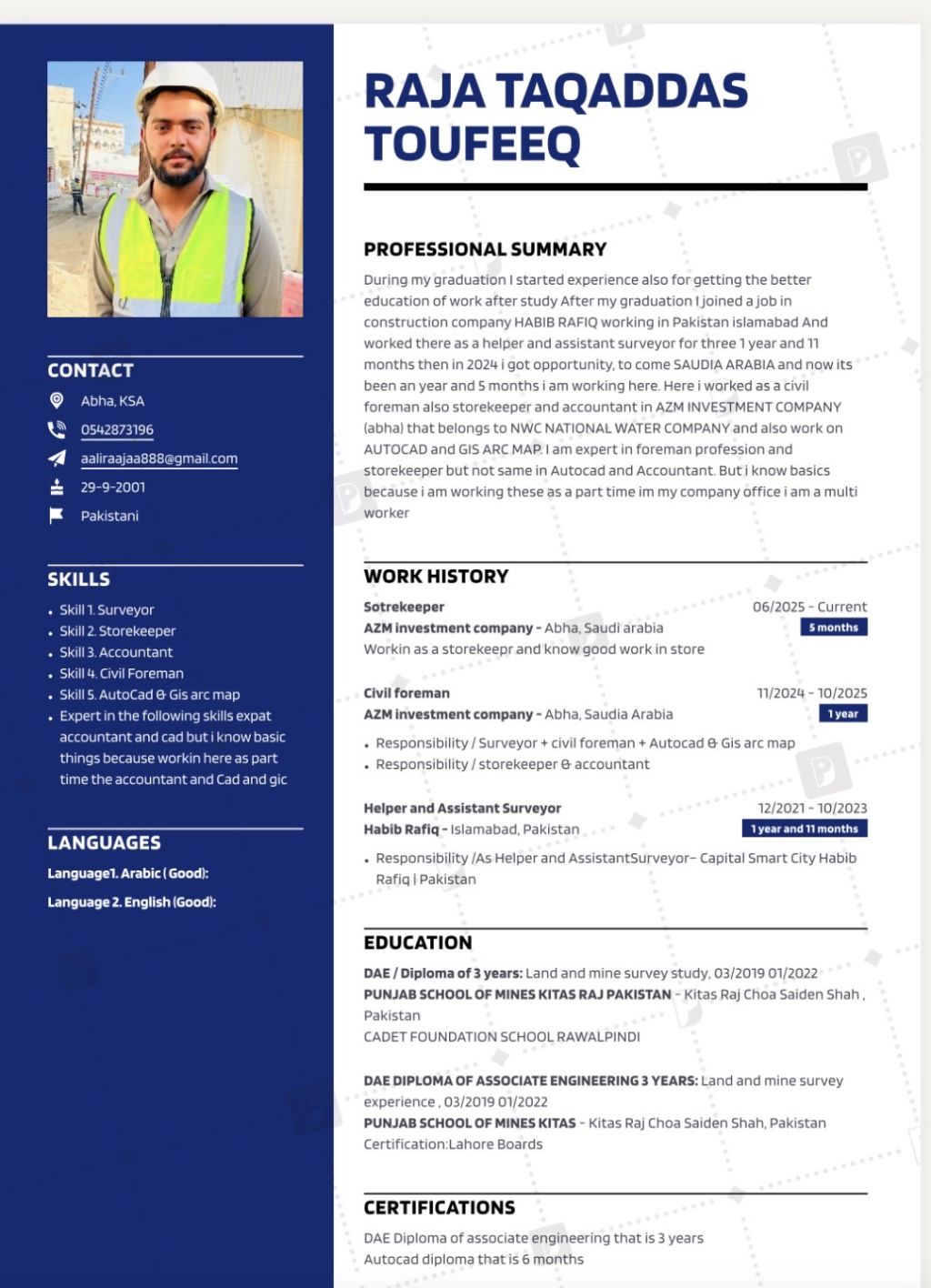 My name is Raja Taqaddas Toufeeq my education is DAE 3 years diploma from Pakistan and almost two years experience in Pakistan then I came to Saudi Arabia in 2024 and now 1 and half year completed working here. One year as a civil foreman and 5 months as a storekeeper also working on AutoCAD and arc map gis and as an accountant also as part time in company office and know the basica very well