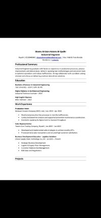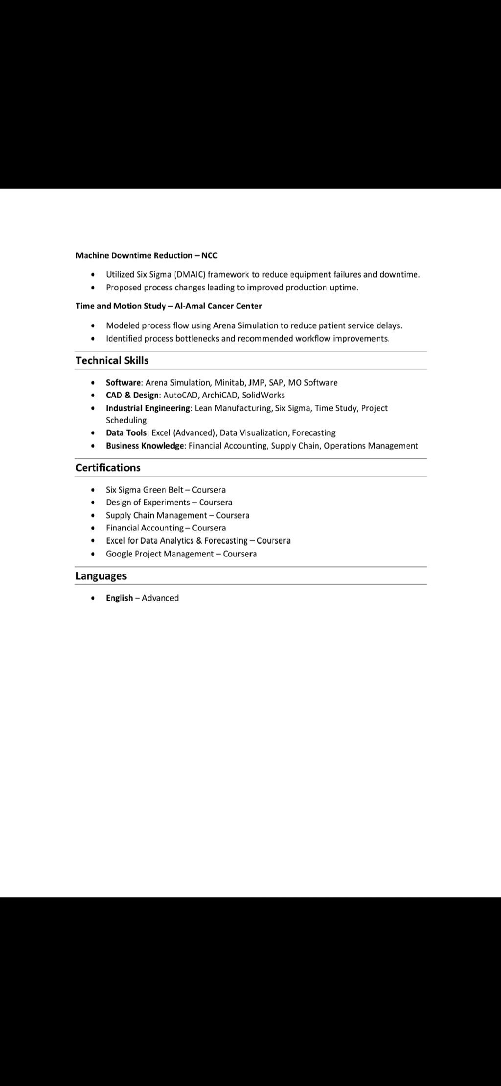 An Industrial Engineer seeking a suitable position in Riyadh. Skilled in process improvement, productivity analysis, quality management, and problem solving using Lean and Six Sigma methods. Proficient in engineering and analytical software including SolidWorks, AutoCAD, JMP, Minitab, and Microsoft Office. Highly organized, detail - oriented, and ready to join immediately. Available for contact
