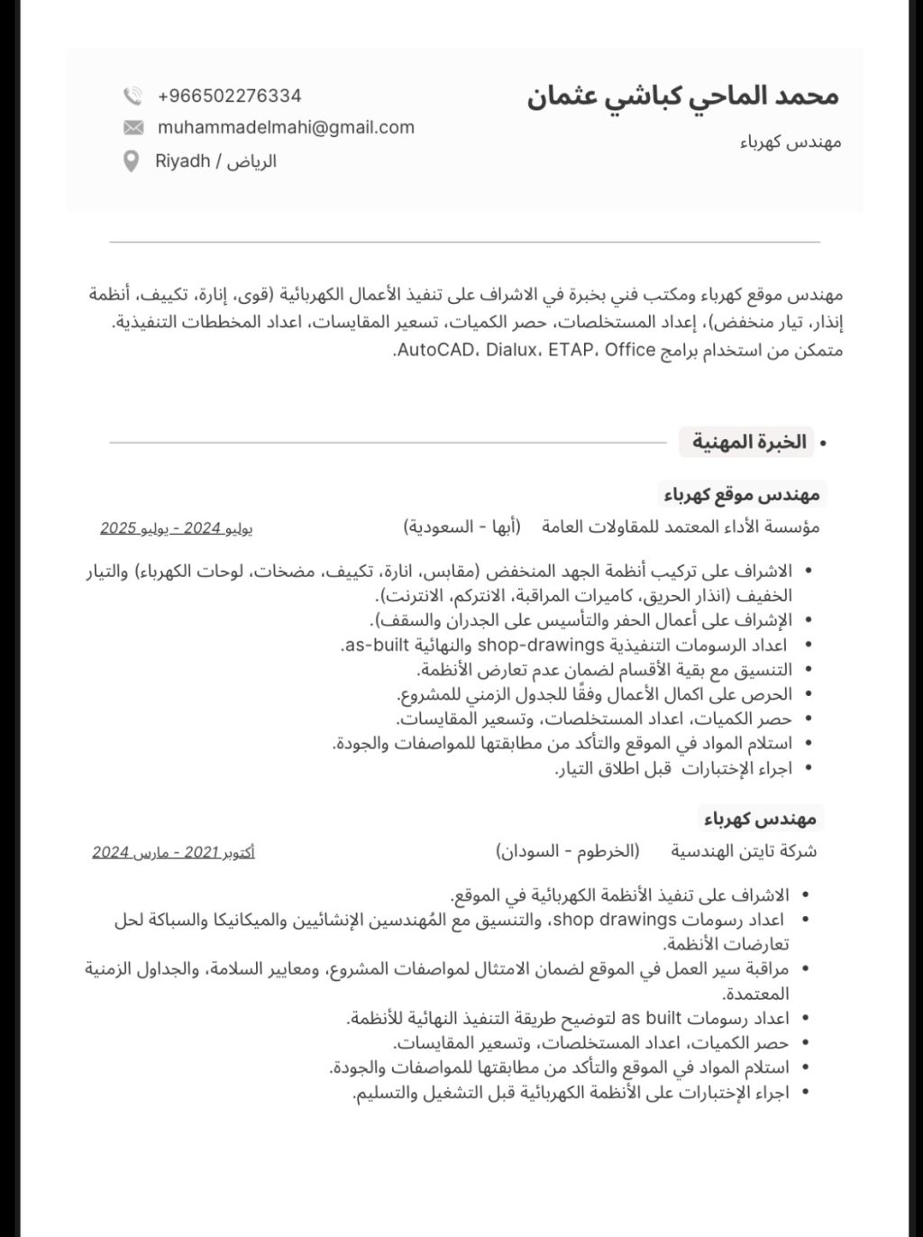 مهندس كهرباء خبرة 4 سنوات في الموقع بالاضافة لأعمال المكتب الفني (رسومات تنفيذية، حصر، تسعير، مستخلصات، اعداد الورقيات) متواجد في الرياض وجاهز للانضمام فورا. يوجد إقامة قابلة للنقل