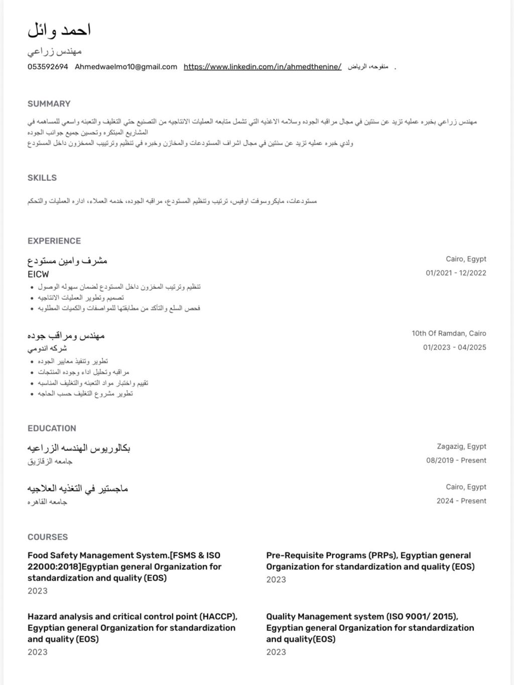 مهندس زراعي تخصص جودة اغذيه ومراقبه حاصل علي بكالوريوس زراعة جامعة الزقازيق خبرة سنتين، وأمين مستودع واشراف خبرة سنتين متاح إقامة سنة قابلة للنقل